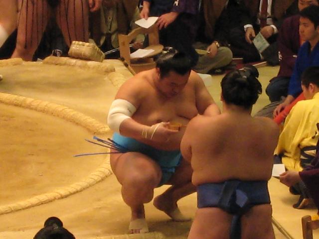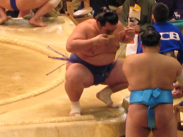 写真は普天王と仲良しであり、ブログ仲間の豊ノ島が友達でもある琴奨菊に水をつけるところ。